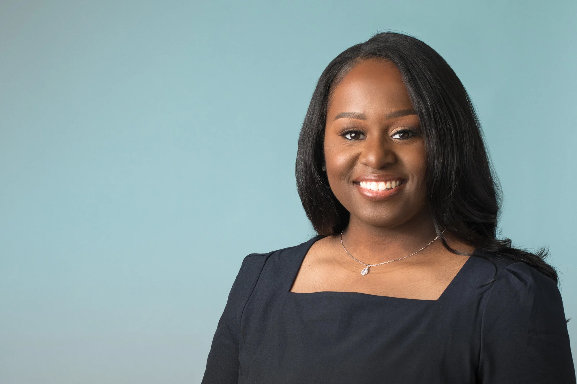This light blue background makes that association work, and it enhances Laneisha’s skin tones, solid blue dress, and her gorgeous smile.
